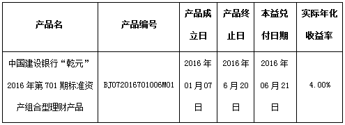 根据与投资者的约定,中国建设银行北京市分行发行的下列理财产品已经到期,现将理财产品兑付及清算情况进行信息披露: