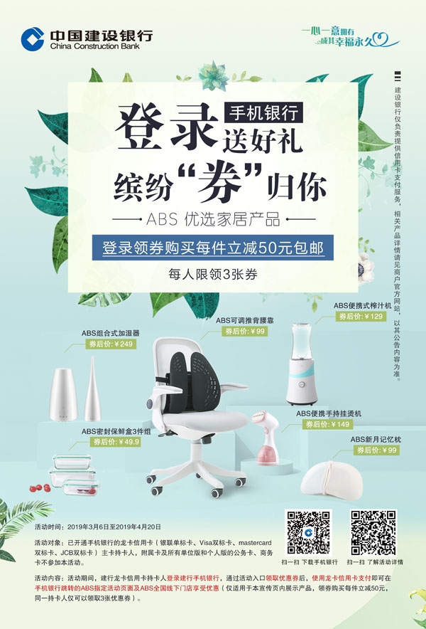 活动期间,建行龙卡信用卡持卡人登录建行手机银行,通过活动入口领取优惠券后,使用龙卡信用卡支付即可在手机银行跳转的ABS指定活动页面及ABS全国线下门店享受优惠(仅适用于本宣传页内展示产品,领券购买每件立减50元,同一持卡人仅可以领取三张优惠券)。