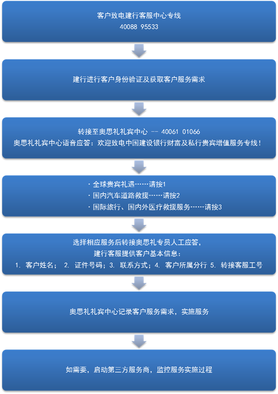 中国建设银行与上海思奥思救援服务有限公司合作面向高端客户推出国际SOS服务,(更名为全球礼遇服务),升级的服务内容新增了国内免费汽车道路救援服务,国际贵宾礼遇服务(签证申请、全球机场贵宾服务、酒店推荐及预订、留学礼遇等服务)。当客户在异乡遇到突发事件需要帮助,可以随时随地拨打全球礼遇服务专线寻求帮助,届时将有专业人员和医生提供24小时的高品质服务,为客户的国际行程保驾护航。