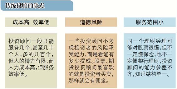 与金融企业打过交道的投资理财者,对于传统投顾存在的软肋应不陌生。总体来讲,传统投顾有这么几个不尽如人意之处: