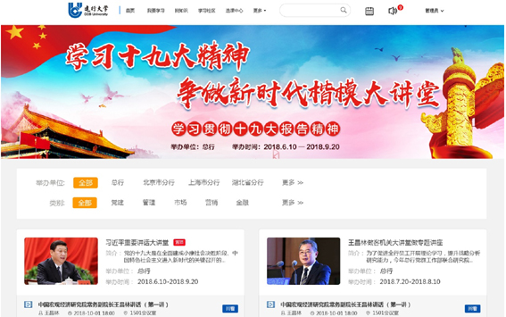 建设金融级安全、战略级服务、全领域实践的建行大学公有云,整合各方优质教育资源,构建“银政校企”大联盟。对企业,赋能组织,激活个体;对国家,大行责任,金智惠民;对世界,背负时代使命,讲好中国故事。在中组部中国干部网络学院建设过程中,建行作为金融系统唯一一家试点单位,已率先实现平台对接,课件共享,学分互认,为全国干部培训工作贡献力量。