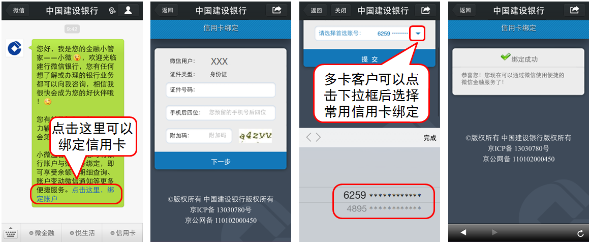 绑定攻略: 添加“中国建设银行”公众号后,通过身份验证即可完成信用卡绑定: