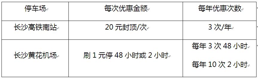 湖南热购卡三湘版白金卡、金卡持卡人可享受长沙高铁南站优惠停车服务,白金卡持卡人可享受长沙黄花机场优惠停车服务: